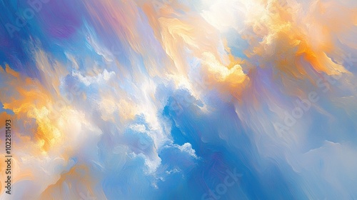 A vibrant abstract depiction of clouds in soft hues of blue, orange, and white.