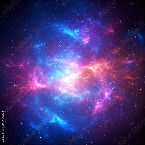 a vibrant, abstract nebula with a mix of colors in a dark space setting. At the center, there are bright blue and purple hues which then transition to warmer orange and red tones towards the outer edg