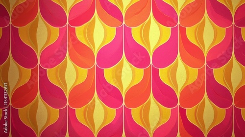 A vibrant, abstract pattern of pink and yellow geometric shapes on a red background.