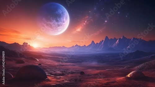 sunrise, sunset, alien, landscape, planet, celestial, body, mountain, vale, desert, rock, stone, space, cosmos, galaxy, nebula, star, planet, atmosphere, glowing, light, colours, red, orange, blue, purple, twilight, horizon, dust, fog, rocky, terrain, outdoors, nature, environment, fantasy, imagination, science, fiction, astronomy, exploration, discovery, adventure, mystery, beauty, wonder, beautiful