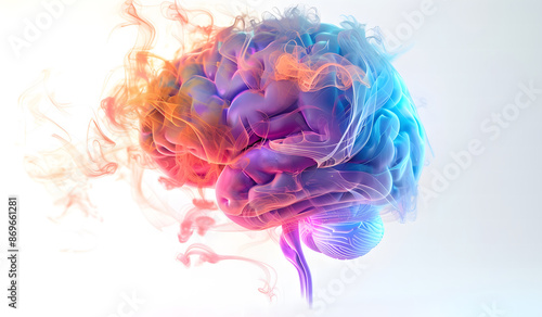 A vibrant and abstract representation of a human brain, featuring swirling, colorful wisps of smoke or energy. The mix of blues, purples, and oranges against a clean white background design