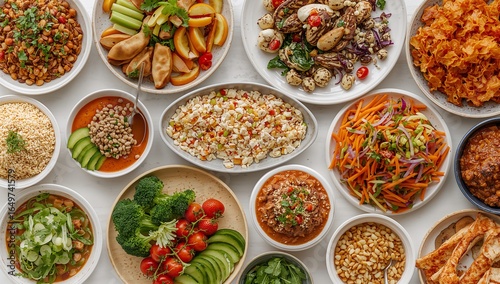 A vibrant and abundant spread of diverse healthy vegetarian and vegan dishes, top view flat lay.