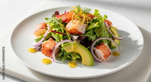A vibrant and appetizing lobster salad featuring avocado, red onion, and fresh greens, artfully arranged on a white plate.
