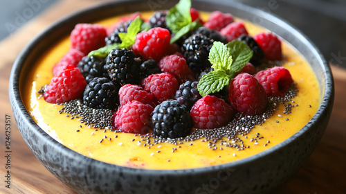A vibrant and colorful smoothie bowl topped with fresh berries, chia seeds, and a drizzle of honey.