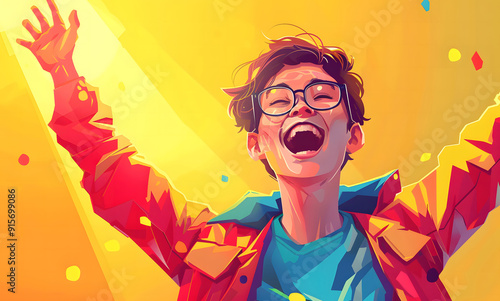 A vibrant and dynamic digital illustration featuring a joyful young man with an afro, wearing colorful clothing and sunglasses. His hands are raised in excitement, with a wide smile on his face,