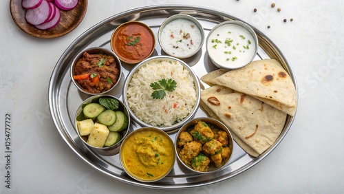 A vibrant and flavorful Indian thali featuring a variety of traditional dishes, including dal, rice, chapati, pickles, and curries.