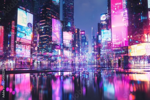 city, night, light, building, urban, street, neon, colourful, futuristic, abstract, digital, vibrant, modern, bright, wet, pavement, atmosphere, architecture, display, screen, signs, billboard, tall, structure, illuminated, dark, sky, cloud, evening, horizon, travel, transportation, district, metropolis, paseo, people, crowd, visual, fantasy, technology, scene, artistic, detail, dynamic, aesthetic, perspective