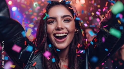 smiling woman, dancing, confetti, vibrant, celebration, fun, friends, nightlife, energy, happiness, festive, leather jacket, youthful, excitement, music, crowd, club, dancefloor, flashy, lively, glam, dynamic, fashion, young, ecstatic, cheerful, fun-loving, 1940s, 1950s, disco, night out, celebratory, upbeat, trend, glitz, entertainment, revelry, nostalgic