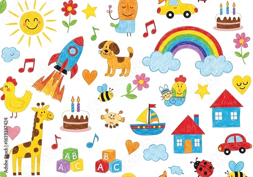 A vibrant and playful collection of colorful childrens drawings featuring a sun, rocket, rainbow, cars, houses, animals, and toys, all isolated on a white background