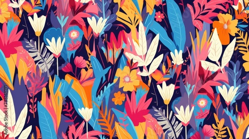 A vibrant and trendy fusion of modern exotic florals creates a captivating jungle pattern in a contemporary collage design This pattern is skillfully hand drawn in a playful cartoon