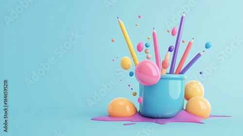 A vibrant arrangement of colorful art supplies bursts from a blue container, creating an eye-catching splash against a soft pastel background, perfect for creative themes.