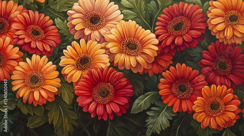 flower, gerbera, daisy, red, orange, yellow, flower petals, nature, bloom, garden, leaf, botanical, vibrant, decoration, beauty, flora, summer, bright, colours, art, illustration, design, painting, aesthetic, fresh, cheerful, arrangement, floral, texture, landscape, organic, growth, seasonal, harmony, high-coloured, detail, background, warmth, elegance, display, natural, visual, colours, lush, spring, joy