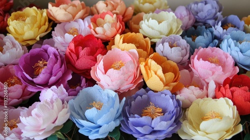 A vibrant arrangement of large, blooming flowers in shades of pink, peach, and blue.