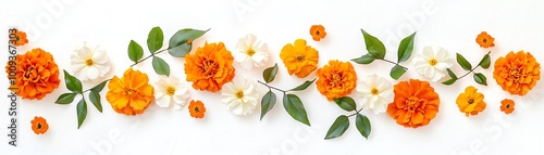 A vibrant arrangement of orange and white flowers with lush green leaves on a clean white background, perfect for spring themes.