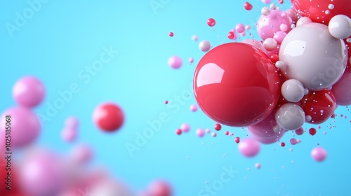 A vibrant arrangement of red, pink, and white spheres appears to be floating in mid-air, set against a clear blue background. The composition evokes a sense of movement and creativity