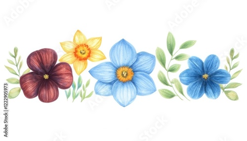 A vibrant arrangement of watercolor flowers in various colors with green leaves, perfect for decoration