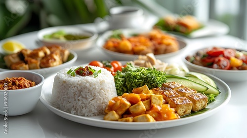 asian, breakfast, food, set, dish, fried, rice, tofu, fruit, elegant, white, plate, neutral, background, rich, colours, vibrant, delicious, healthy, colourful, fresh, traditional, authentic, homemade, flavorful, aromatic, tempting, mouth-watering, appetising, inviting, deliciously, delectable, opulent, abundant, plentiful, varied, diverse, satisfying, nourishing, wholesome, balanced