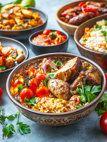 food, meal, lunch, dinner, cookery, dish, variety, assortment, colourful, healthy, balanced, cooked, prepared, presentation, delicious, tasty, appetising, epicure, culinary, eatery, bowl, platter, tomatoes, vegetable, meat, chicken, rice, sauce, herb, parsley, grain, lentil, buffet, serving, table, still life