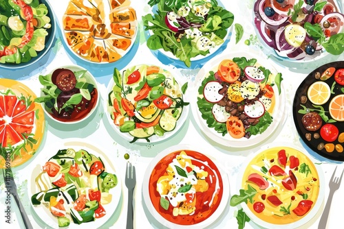 A vibrant assortment of colorful salads and dishes, showcasing fresh ingredients and a variety of flavors.