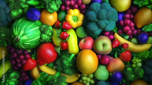 fruit, vegetable, colourful, fresh, healthy, arrangement, display, natural, lighting, produce, organic, broccoli, grape, watermelon, apple, banana, strawberry, pepper, lime, greener, citrous, seasonal, harvest, nourishment, diet, vegetarian, market, vitamin, culinary, cooking, vibrant, ripe, health, epicure, agriculture