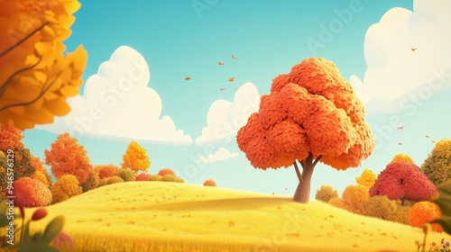 autumn, orange, tree, colourful, foliage, grassy, hill, fluffy, cloud, seasonal, landscape, nature, outdoors, scenic, view, idylli, setting, peaceful, scene, fall, colours, tree, leaf, rural, countryside, serene, vibrant, sunny, day, warmth, gold, hours, flora, fauna, environment, calmness, hill, vegetation, picturesque, beauty, bright, cheerful, art, illustration, animated, scenery, cartoon, style, graphic, design