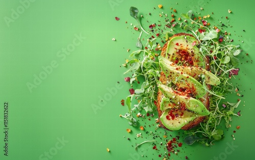 A vibrant avocado toast with chili flakes and microgreens, on a bright green background