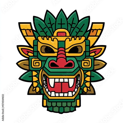 mask, aztec, green, gold, yellow, red, illustration, design, ancient, culture, heritage, mythology, mexico, tribal, geometric, pattern, leaf, head, face, fierce, teeth, eye, powerful, intense, symbolic, ritual, ceremony, decoration, flat, bold, line, colourful, stylised, vector, artwork, traditional, jaguar, stone, carving, spirit, emerald, lime, forest, gold, amber, lemon, crimson, scarlet