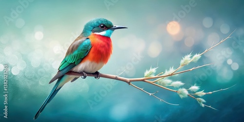 bird, avian, feathered, colourful, vibrant, plumage, perch, tree branch, twig, nature, wildlife, animal, fauna, beauty, serenity, peaceful, tranquil, bright, pastel, bokeh, soft focus