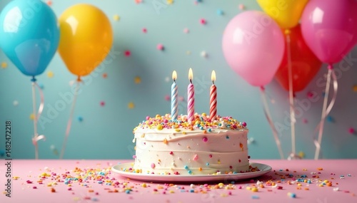 A vibrant birthday party scene with balloons, cake, and confetti , festive, design, background