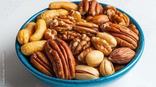 A vibrant blue bowl filled with a variety of nuts including pecans, almonds, and cashews is displayed on a clean white surface, ideal for snacking or adding to meals.