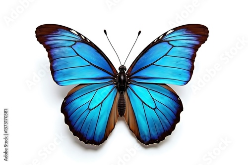 A vibrant blue morpho butterfly, a symbol of transformation and hope, showcased against a pristine white backdrop.