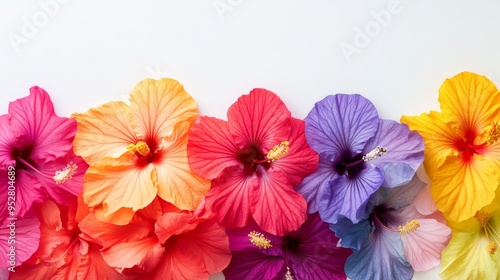 hibiscus, flower, floral, border, rainbow, colours, vibrant, tropical, exotic, summer, white, background, nature, bloom, blossom, bright, colourful, beautiful, delicate, flower petals, fresh, plant, photo, design, art, illustration, wallpaper, graphic, pattern, texture, decoration, banner, poster, card, invitation, wedding, celebration, holiday, spring, garden, floral pattern, botanical, floral arrangement