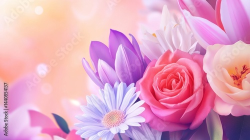 A vibrant bouquet of colorful flowers including roses and lilies against a soft pastel background