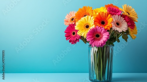 A vibrant bouquet of colorful gerbera daisies in a clear glass vase against a bright blue background.