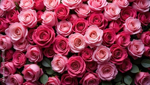 A vibrant bouquet of lush pink roses gracefully overlap, framed by delicate green foliage, creating an enchanting floral tapestry