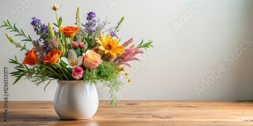 A vibrant bouquet of mixed flowers in a white ceramic vase on a wooden table against a light wall