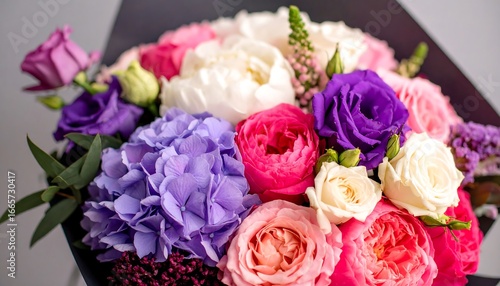 flower, bouquet, rose, hydrangea, peony, colourful, vibrant, closeup, floral, arrangement, display, beautiful, pretty, mixed, pink, purple, white, green, dark, black, gift, present, springtime, spring, summer, delicate, nature, detail, blossom, flower petals, stem, leaf, bright, creative, modern, elegant, stylish, professional, decorative, stunning, amazing, marvellously, fantastic, gorgeous, lovely, charming