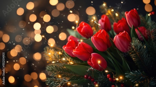 A vibrant bouquet of red tulips and pine branches surrounded by glowing fairy lights and festive decorations