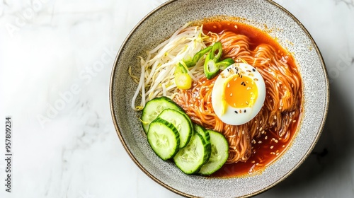 A vibrant bowl of Bibim Guksu Naengmyeon with cold noodles, sliced cucumbers, and a boiled egg, on a white marble surface, ideal for a cookbook or food blog