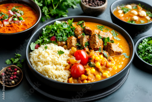 A vibrant bowl of curry with meat, couscous, fresh herbs, and tomatoes, served alongside two smaller bowls of soup and spices, showcasing a colorful, appetizing meal.