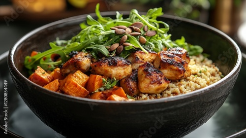 chicken, sweet potato, salad, greener, arugula, seed, healthy, meal, nourishment, garnish, bowl, cookery, epicure, cooking, fresh, colourful, vegetable, protein, fiber, dish, ingredient, organic, tasty, presentation, culinary, dining, favor, appetence, wholesome, alimentary, lunch, dinner, snack, receipe, chef, harvest, seasonal, balanced, energy, vibrant, delicious, plating, texture, aroma, indulgence, freshness, satisfaction