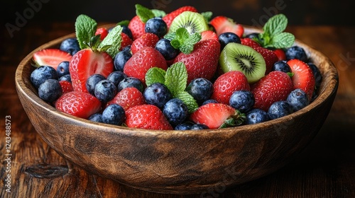 A vibrant bowl of mixed fresh berries and mint leaves on a rustic wooden table