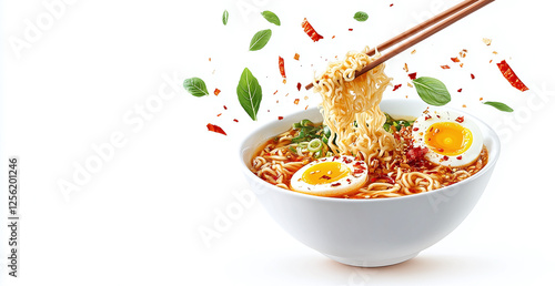 A vibrant bowl of noodle soup with a soft boiled egg, spring onions and seasoning, being lifted by chopsticks, with herbs and spices floating around.