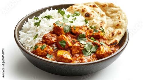 A vibrant bowl of spicy chicken tikka masala with basmati rice and naan bread on a white background