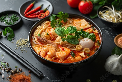 A vibrant bowl of spicy noodle soup garnished with fresh herbs and vegetables, showcasing a culinary masterpiece on a modern table