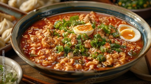 A vibrant bowl of spicy noodles topped with green onions and a soft-boiled egg, perfect for a delicious meal.