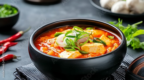 A vibrant bowl of spicy tofu soup garnished with green onions, surrounded by fresh ingredients, showcasing a hearty, flavorful dish.