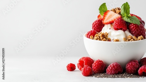 A vibrant bowl of yogurt adorned with fresh raspberries, strawberries, and granola, offering a healthy and appealing breakfast option rich in flavor and texture.