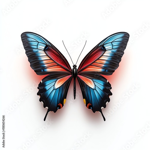 A vibrant butterfly with striking blue and red wings, showcasing intricate patterns against a plain background.