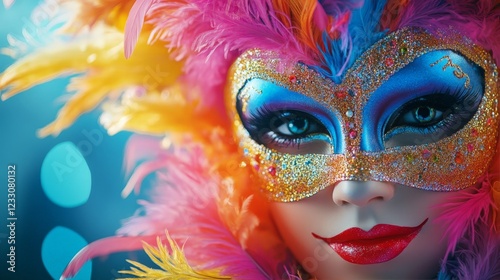 A vibrant carnival mask with colorful feathers and abstract particles on a dark background. Perfect for festivals or celebration themes.